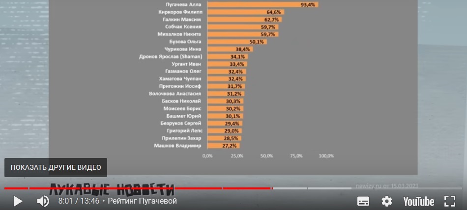 “…обратимся к настоящему профессиональному исследованию, которое проводили эксперты Дигитал Агентства Империал. На основе мониторинга российских СМИ они составили рейтинг самых упоминаемых творческих персон России за прошлый год. Сказать, что Алла Пугачёва возглавила этот рейтинг, это не сказать ничего. Давайте посмотрим”